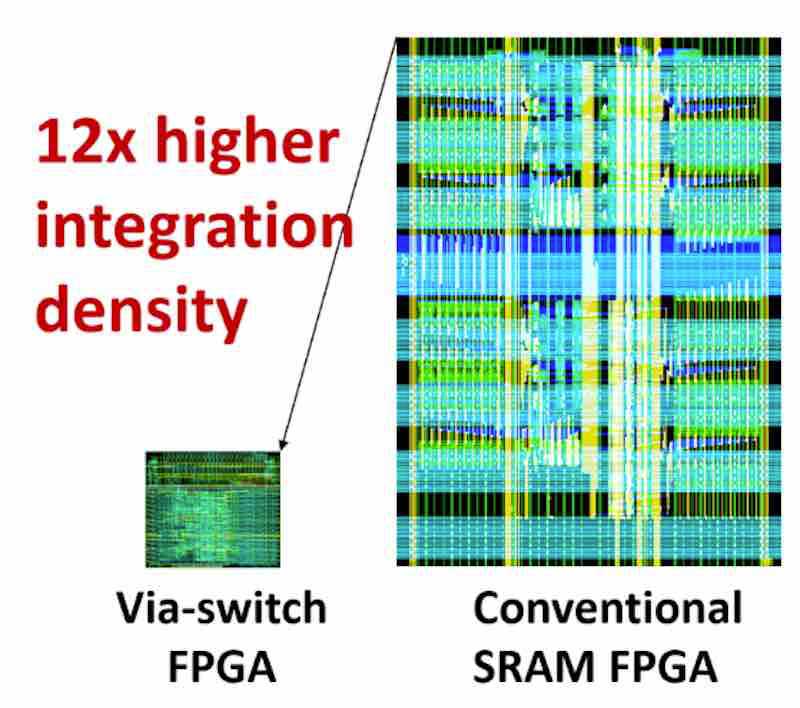 (大阪大學開發(fā)的Via-Switch FPGA與常規(guī)SRAM FPGA在尺寸和集成密度上的比較)