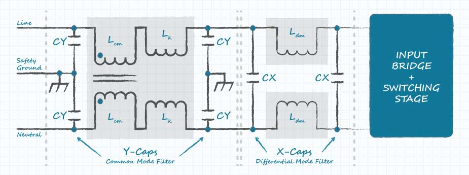 外部電源通常在AC輸入電路中包含分立的電感和電容,以衰減噪聲從電源沿AC輸入電源線傳導(dǎo)出去的情況。內(nèi)部PCB旨在容納這些組件,并且在安裝了組件的情況下執(zhí)行了法規(guī)安全性測試。一旦電路設(shè)計(jì)和測試活動(dòng)完成,為滿足客戶需求而對(duì)輸入過濾器元件進(jìn)行的更改通常會(huì)非常麻煩。