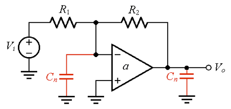 具有放大器寄生電容的電路模型。紅腳顯示的是電流可以作為負(fù)反饋傳播回同相輸入的位置