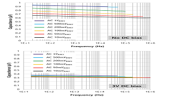 4.不同的頻率水平也會影響有效電容,這取決于:無直流偏置(上);施加3V直流偏置(底部)。